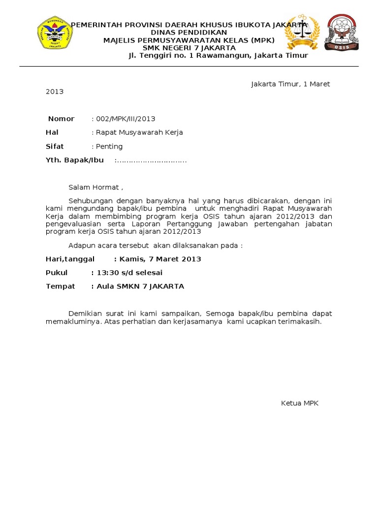 Bagi anda yang sudah bekerja pastinya sering dong mengalami urusan surat menyurat. Maka dari itu, kali ini kami akan memberikan referensi kepada anda mengenai seperti apa contoh surat dinas yang dikeluarkan oleh osis, baik yang digunakan untuk rapat, maupun himbauan yang berhubungan lomba yang akan diadakan di. Lawang sewu no 12, semarang. Osis sma negeri 1 medan. Contoh surat osis sma, contoh surat undangan rapat osis sma. Sehubungan dengan telah dilaksanakannya dies natalis sma airlangga yang ke 15, maka akan diadakannya rapat penyerahan laporan pertanggungjawaban yang akan dilaksanakan pada Karena pentingnya rapat tersebut, kami minta kedatangan bapk/ibu tepat waktu. Organisasi siswa intra sekolah (osis) sma n 1 gombong Undangan rapat osis bahasa inggris. Karena undangan rapat osis merupakan salah satu surat resmi, anda tentu saja harus mengikuti beberapa kaidah dalam pembuatan surat resmi. Contoh surat undangan resmi 1. Atas kehadiran bapak/ibu kami ucapkan terima kasih. Organisasi siswa intra sekolah (osis) smkn 2 blitar.